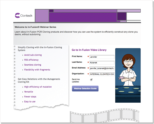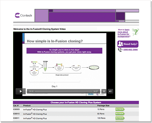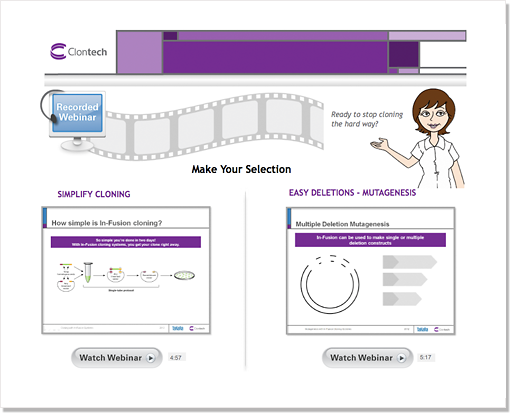 The In-Fusion product line is a cornerstone of Clontech’s offerings, yet materials created by different teams over time looked disjointed and scattered. I initiated and executed an overhaul of various online materials focusing on product webinars, achieving visual cohesion and continuity in addition to optimizing usability.