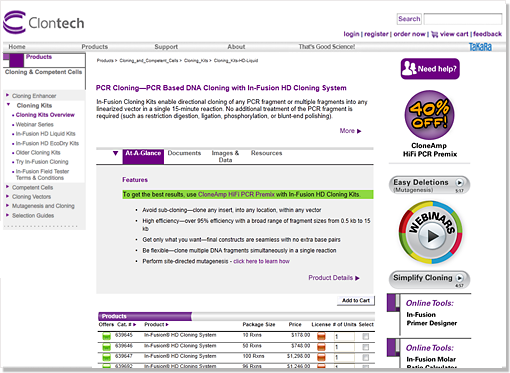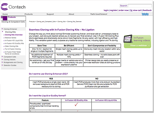 The In-Fusion product line is a cornerstone of Clontech’s offerings, yet materials created by different teams over time looked disjointed and scattered. I initiated and executed an overhaul of various online materials focusing on product webinars, achieving visual cohesion and continuity in addition to optimizing usability.
